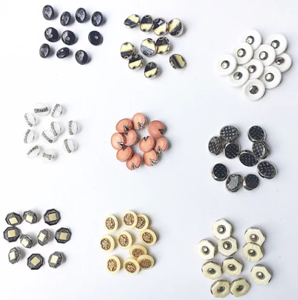 - Có chất liệu được làm bằng hợp kim hoặc sắt, để tạo ra từng chiếc nút khác nhau thì yêu cầu phải có khuông mẫu khác nhau, sau khi ép ra phôi nút kim loại thì nút áo sẽ được xử lí xi mạ hoặc phun sơn tĩnh điện